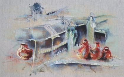 crayon de couleur, peinture acrylique très diluée etc. Les oeuvres de cette série sont travaillés sur